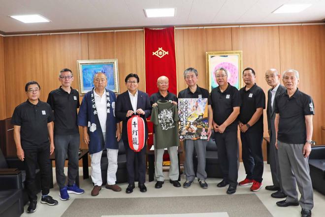 「江迎千灯籠まつり・水掛け地蔵まつり」の開催報告とPRのため市役所を訪れた実行委員会の皆さんと市長
