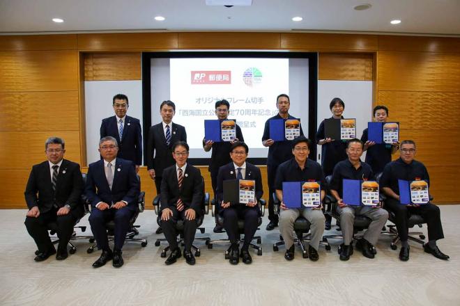 西海国立公園指定70周年記念「オリジナルフレーム切手」の贈呈式に出席された関係者の皆さんと市長