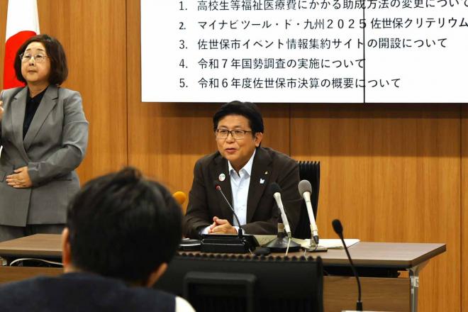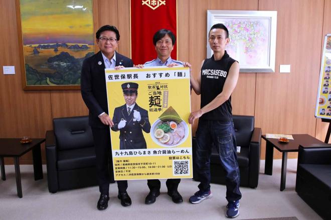 2025駅長対抗ご当地「麺」総選挙のPRのため市役所を訪れた佐世保駅の横田駅長と市長