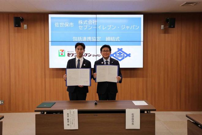 包括連携協定締結式のため市役所を訪れた株式会社セブン-イレブン・ジャパンの有吉ゾーンマネージャーと市長