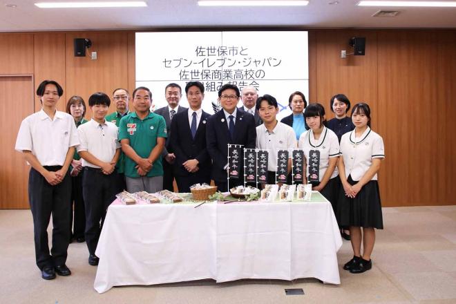 西海国立公園指定70周年を契機として佐世保商業高校とセブン-イレブン・ジャパンが連携して開発した商品の報告会で記念撮影をする市長