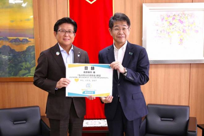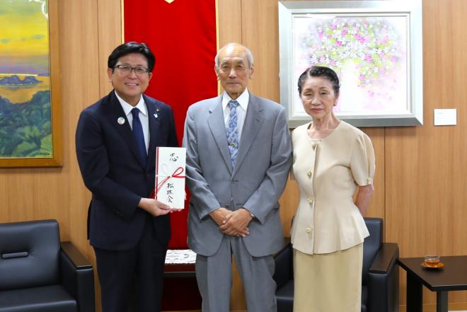 佐世保市社会基金へ寄付金の贈呈のため市役所を訪れた尚武館道場の安里館長と市長