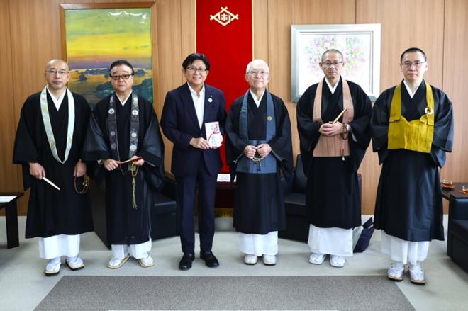 図書館へ寄付の贈呈のため市役所を訪れた佐世保佛教連合会の皆さんと市長