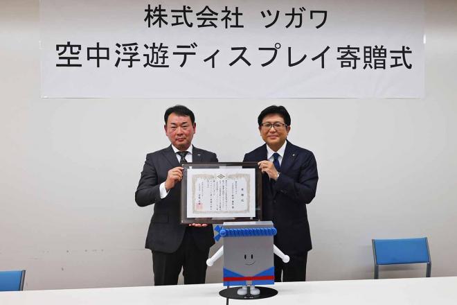 少年科学館星きらりで空中浮遊ディスプレイの寄贈式を行う株式会社ツガワの駒田代表取締役社長と市長