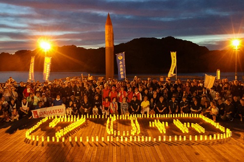 「九十九島CLEANUP大作戦!」に参加された皆さんとペットボトル灯籠を作成し記念撮影をする市長
