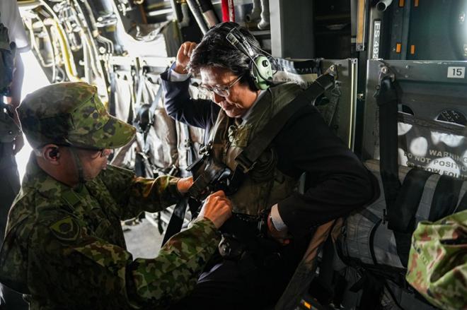 陸上自衛隊佐賀駐屯地の視察でオスプレイに搭乗する市長