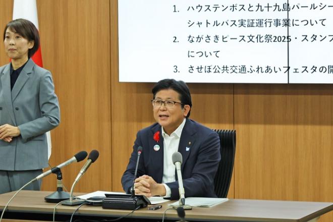 NEWS M SASEBOの収録に臨む市長(長尾半島)