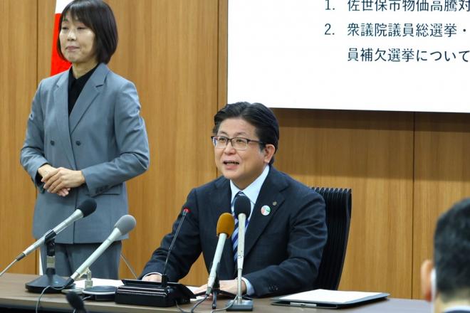 定例記者会見で記者からの質問に答える市長