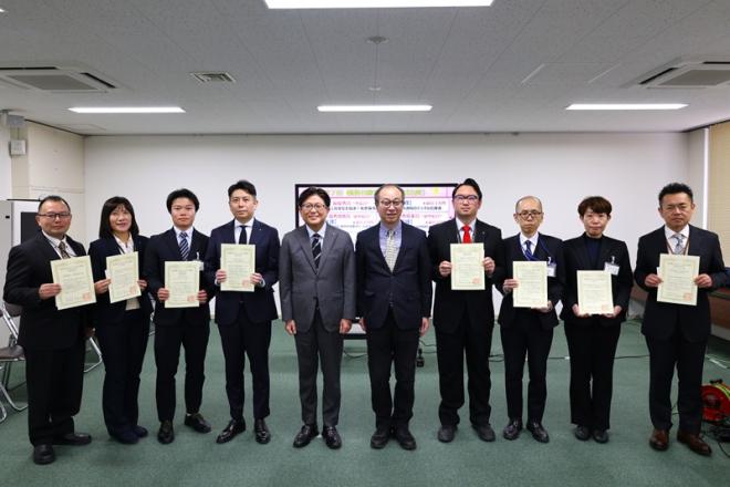 ジブン発信フォーラムで業務改善事例の表彰を行った皆さんと記念撮影をする市長