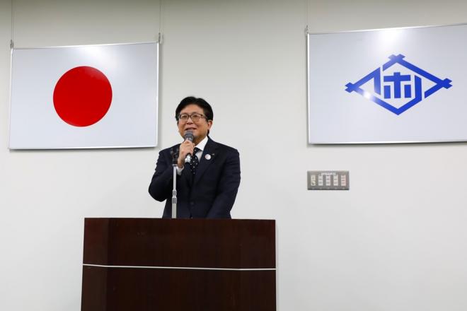 仕事始め式で職員に訓示を述べる市長