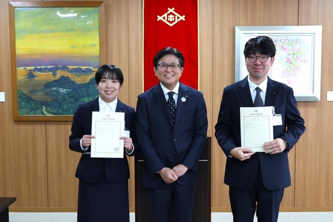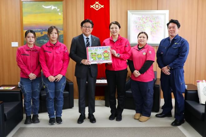 幼児向け紙芝居の贈呈のため市役所を訪れた(有)壹良産業の皆さんと市長