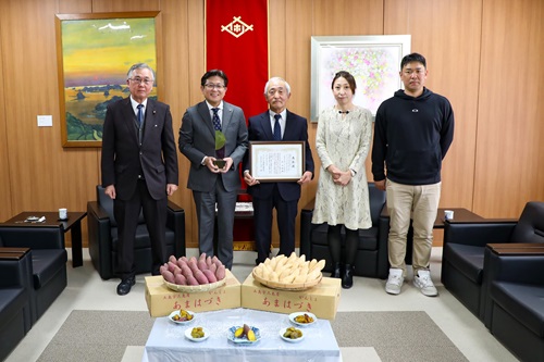 日本さつまいもサミット2025-2026でさつまいも・オブ・ザ・イヤーのその他部門で日本一を受賞した報告のため市役所を訪れた宇久町の辻 市朗さんと市長