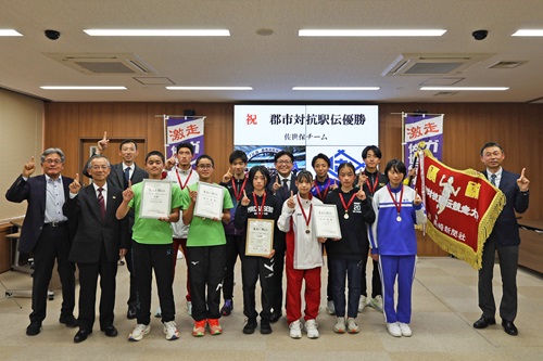第72回長崎県郡市対抗駅伝大会の優勝報告に市役所を訪れた選手11人と関係者の皆さんと記念撮影をする市長