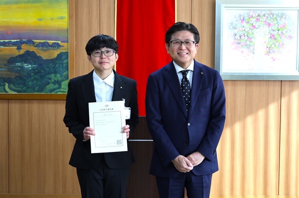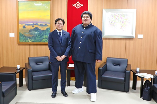 大相撲立浪部屋入門の報告に市役所を訪れた北松農業高校3年の中里昌暉さんと市長