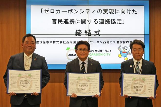 ゼロカーボンシティ実現に向けた官民連携に関する連携協定締結式のため市役所を訪れた(株)西九州させぼパワーズの杉本代表取締役社長と西部ガス佐世保(株)の藤井代表取締役社長と市長
