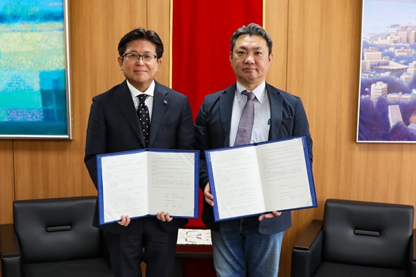 災害時におけるキッチンカーによる炊き出しの実施等に関する協定締結式のため市役所を訪れた長崎県キッチンカー協会の安井代表理事と市長