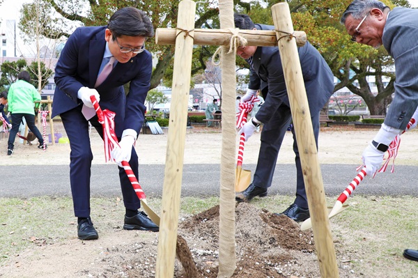 「キリンビール晴れ風ACTION」の寄付事業のPRと今後の活動拡大のためサクラ植樹記念式典でサクラの植樹をする市長