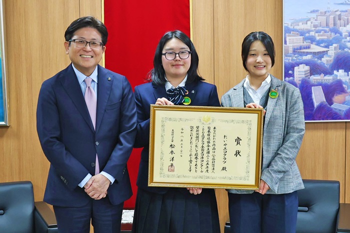 「こどもエコクラブ・全国エコ活コンクール」壁新聞部門で文部科学大臣賞を受賞された報告のため市役所を訪れただいやエコクラブの皆さんと市長