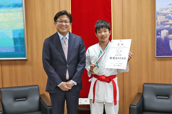 「第5回全日本少年少女空手道選抜大会」の小学5年男子組手の部で優勝の報告に市役所を訪れた松尾彪雅さんと市長