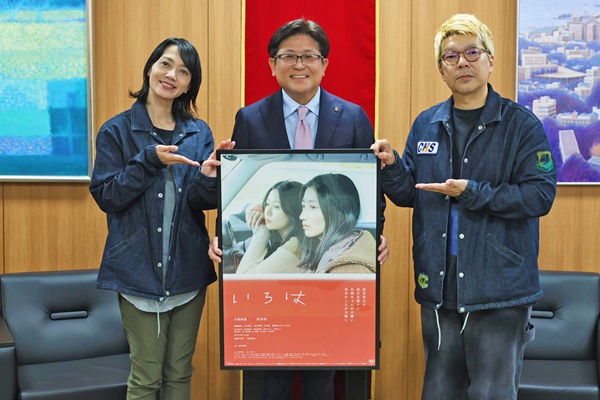 新作映画「いろは」のPRに市役所を訪れた本市出身の横尾初喜映画監督と女優の遠藤久美子さんと市長