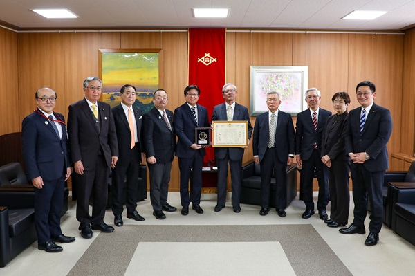 陸上自衛隊西部方面隊創隊70周年記念行事に際し、相浦地区の「防衛基盤の育成」に貢献した感謝状の受領報告に市役所を訪れた相浦地区自治協議会の皆さんと市長