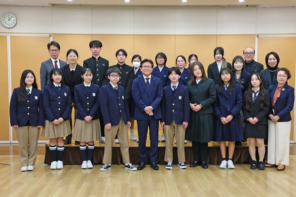 令和7年度青少年交流事業・国際交流員活動報告会に出席された関係者の皆さんと記念撮影をする市長