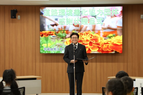 道路環境美化協力団体の感謝状贈呈式であいさつする市長