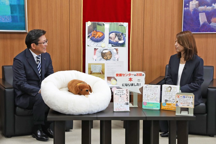 佐世保市動物愛護センターが題材の著書を市内小学校および義務教育校へ寄贈するため市役所を訪れた著者のtamtamさんと市長