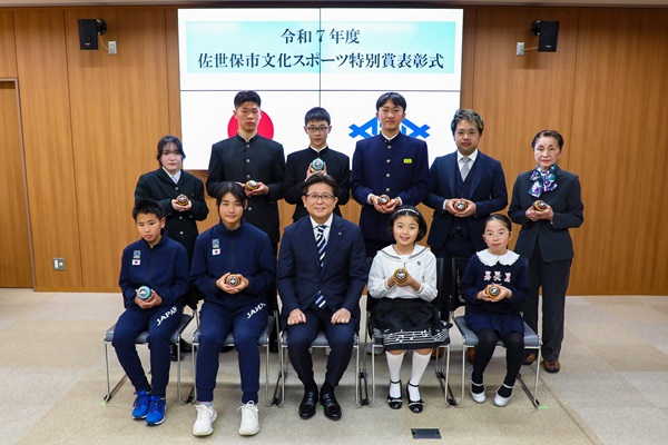 令和7年度佐世保市文化スポーツ特別賞の表彰式のため市役所を訪れた皆さんと市長