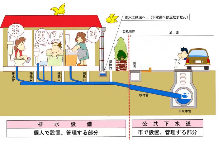 排水設備とは、屋内と屋外(敷地内)の排水管並びに水洗トイレ、手洗、浴室及び炊事場等一切の排水施設をいいます。排水設備は建物の持ち主などが設置し、維持管理を行わなければなりません。