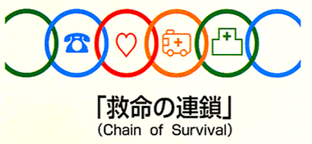 尊い生命を救うためには、救命のバトンが途切れないように、迅速に引き継ぐことが大切です。これを「救命の連鎖」と呼んでいます。
