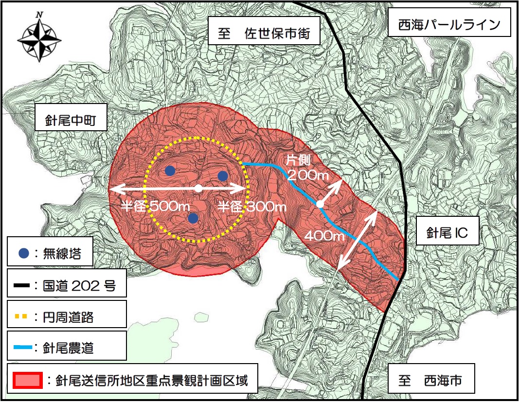 無線塔の円周道路半径300メートルに200メートルを加えた半径500メートル、また、針尾農道の中心より片側200メートルずつ合計400メートルの範囲を、針尾送信所地区重点景観計画区域として定め、令和3年4月1日より運用を開始しました。