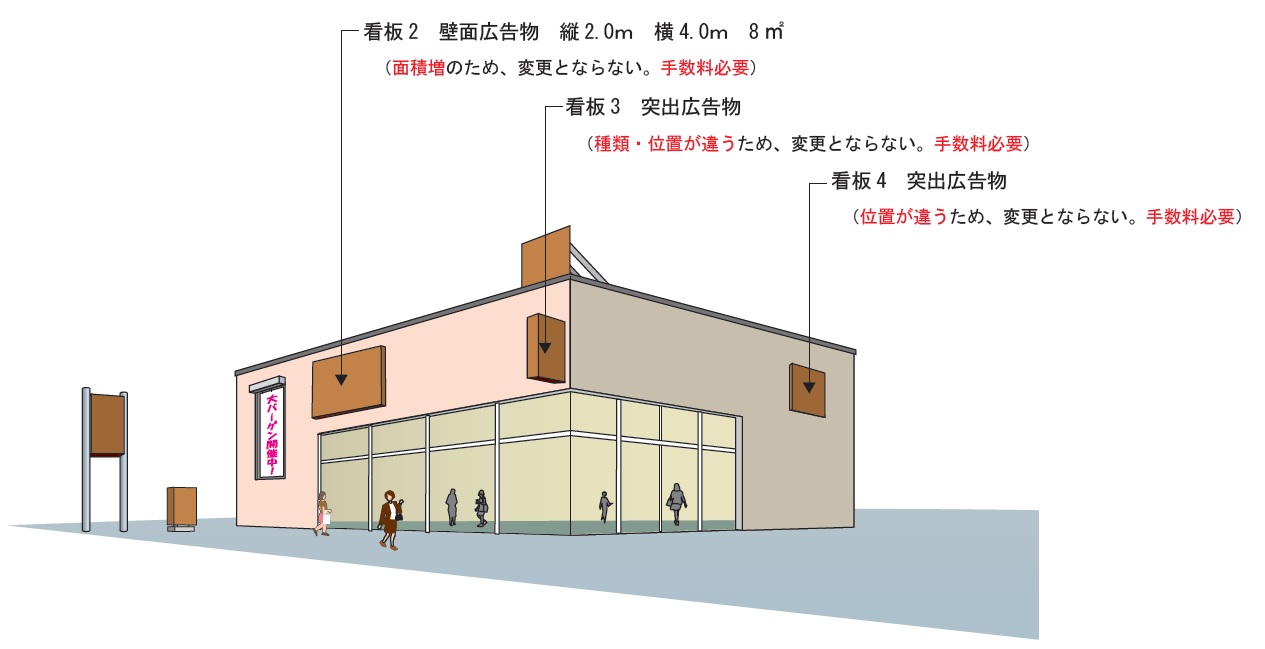 看板1(上図)から看板4(下図)へ変更する場合は、位置が違うため、新規として許可申請が必要です。(看板1を除却し、看板4を新設する取扱いとなります。)